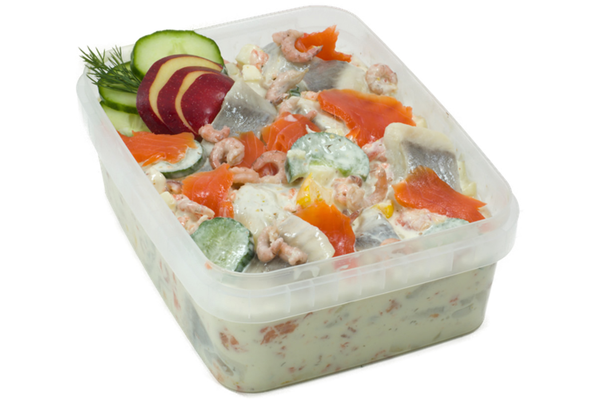 Nordseekrabben, Räucherlachs, Heringsstücke, frische Gurke, gelbe Paprika, Apfel, Dressing