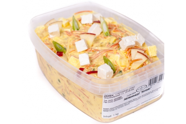 Hirtenkäse, Mayonnaise, Ananas, Porree, Äpfel, Karotten, Sellerie, Calvados, Curry