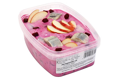50% Fischanteil, Zarte Heringsfilets ohne Haut, Äpfel, rote Bete, Gewürzgurken, Mayonnaise