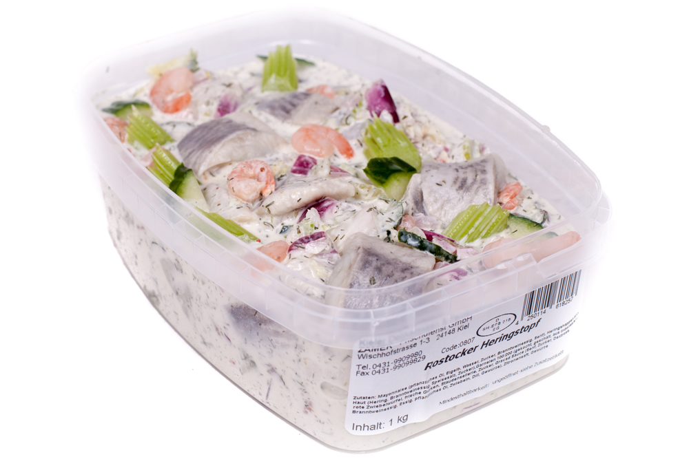 Garnelen, zarte Heringshappen ohne Haut, frische Gurken, rote Zwiebeln, Staudensellerie, Dill, Mayonnaise